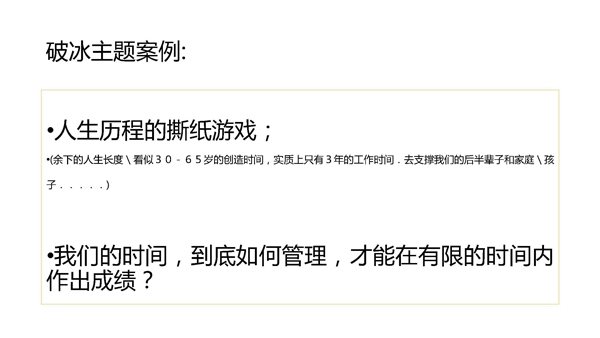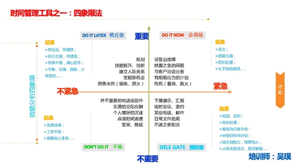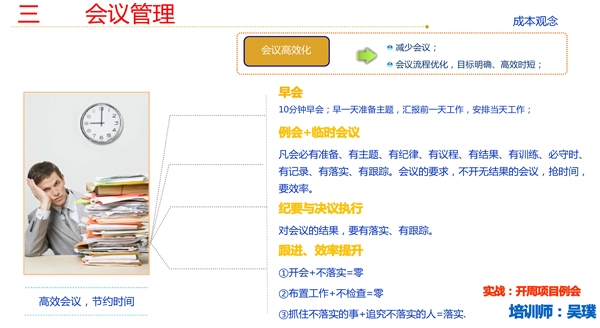 接下来吴老师从时间特征和时间与效能、效率、极致的关系让大家认识到时间的本质,进而引申到时间管理工具方向,向大家介绍了四象限法、ABC分类法、番茄法。在接下来的会议管理中,大家更是深受启发,顿时明白了为何平日的会议总是劳而无功。