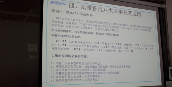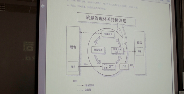 培训的主要内容是质量管理体系的基础知识。首先老师针对质量标准的诞生、历史以及相关的质量体系系统进行了简短的说明,之后重点讲解了”客户满意度”和”PDCA持续改进”的重要性。期间老师穿插了许多企业实际案例加以说明,更好的向员工传达了质量管理体系存在的必要性和重要性。